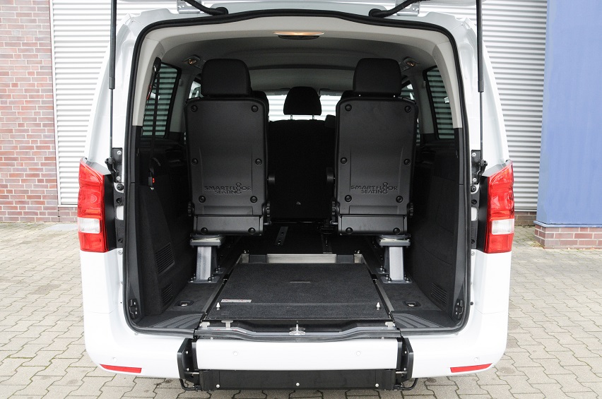Le Mercedes Classe V PMR ainsi que le Vito Tourer L2/L3 PMR décaissés sont aménagés pour les taxis de personnes à mobilité réduite, offrant la possibilité de passer d’un véhicule 7 places à un véhicule 5 places plus une personne à mobilité réduite en fauteuil roulant en 5 secondes sans effort ni de sièges à retirer du véhicule.